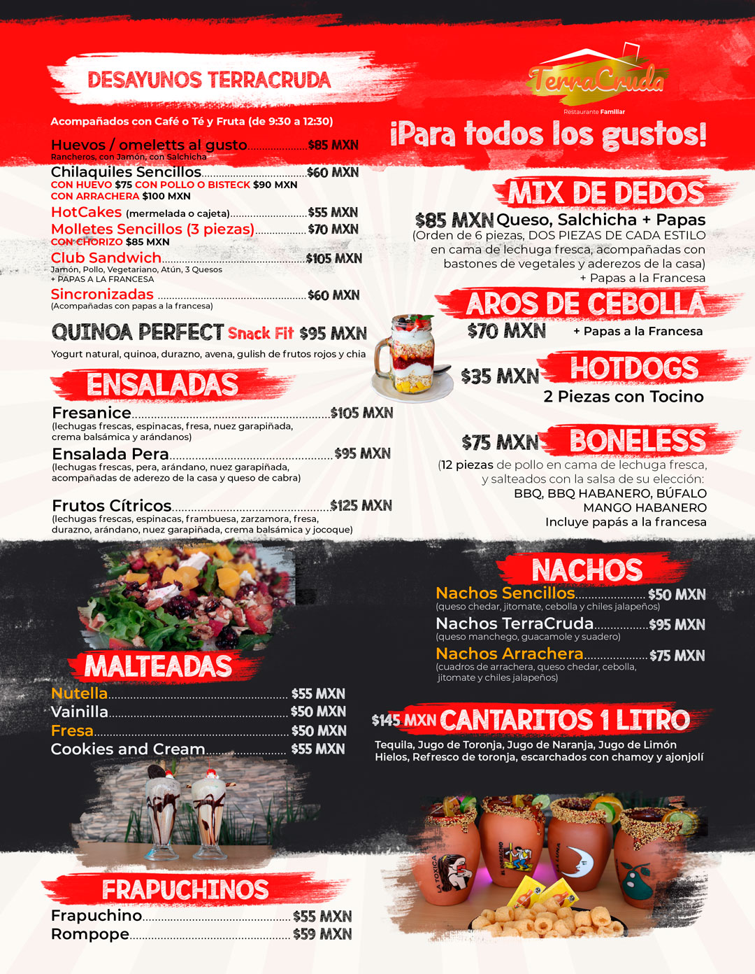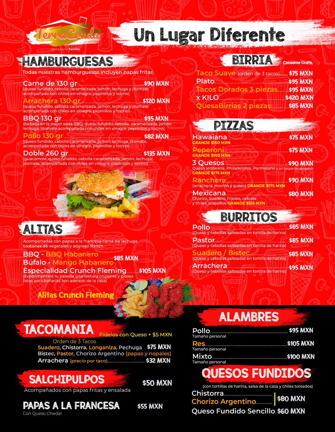 Hamburguesas, Pizzas, Alitas, Ensaladas, Burritos, Nachos, HotDogs, Quesos Fundidos, Alambres, Malteadas, Crepas, Cerveza de Barril, Volovanes, Empanadas Argentinas, Alitas, Boneles y mucho más.